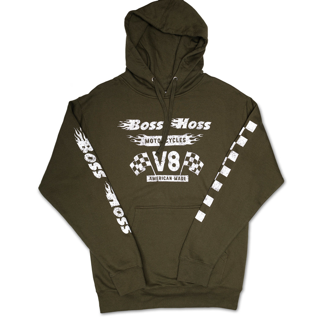 Olive Green Checkered Flag Flaming Finish Pullover Sweatshirt Hoodie