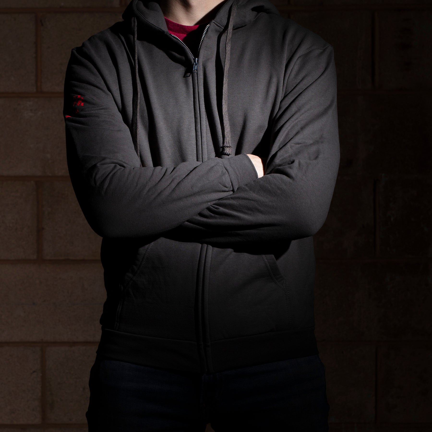 Heavy weight zipper sweatshirt in gray with flaming Boss Hoss pattern across the chest in orange to yellow. The sleeves include screenprinted designs as well. Made with 100% cotton. Adjustable strings around the hood for added comfort