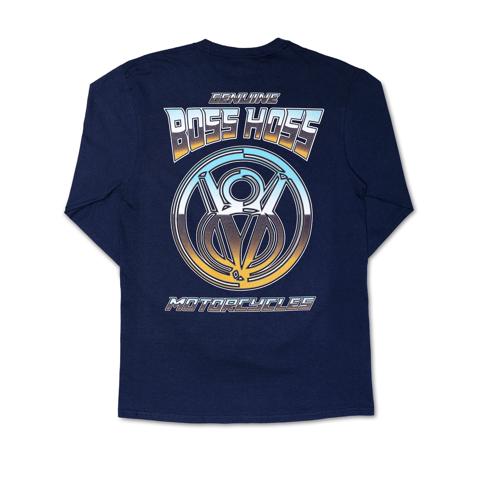 Fresh chromatic screen printed Boss Hoss Motorcycles long sleeve tee with front breast printing. Features a full back printed design with blue chrome flames down both sleeves. Dress to impress in this navy blue heavyweight long sleeve tee made of 100% cotton.