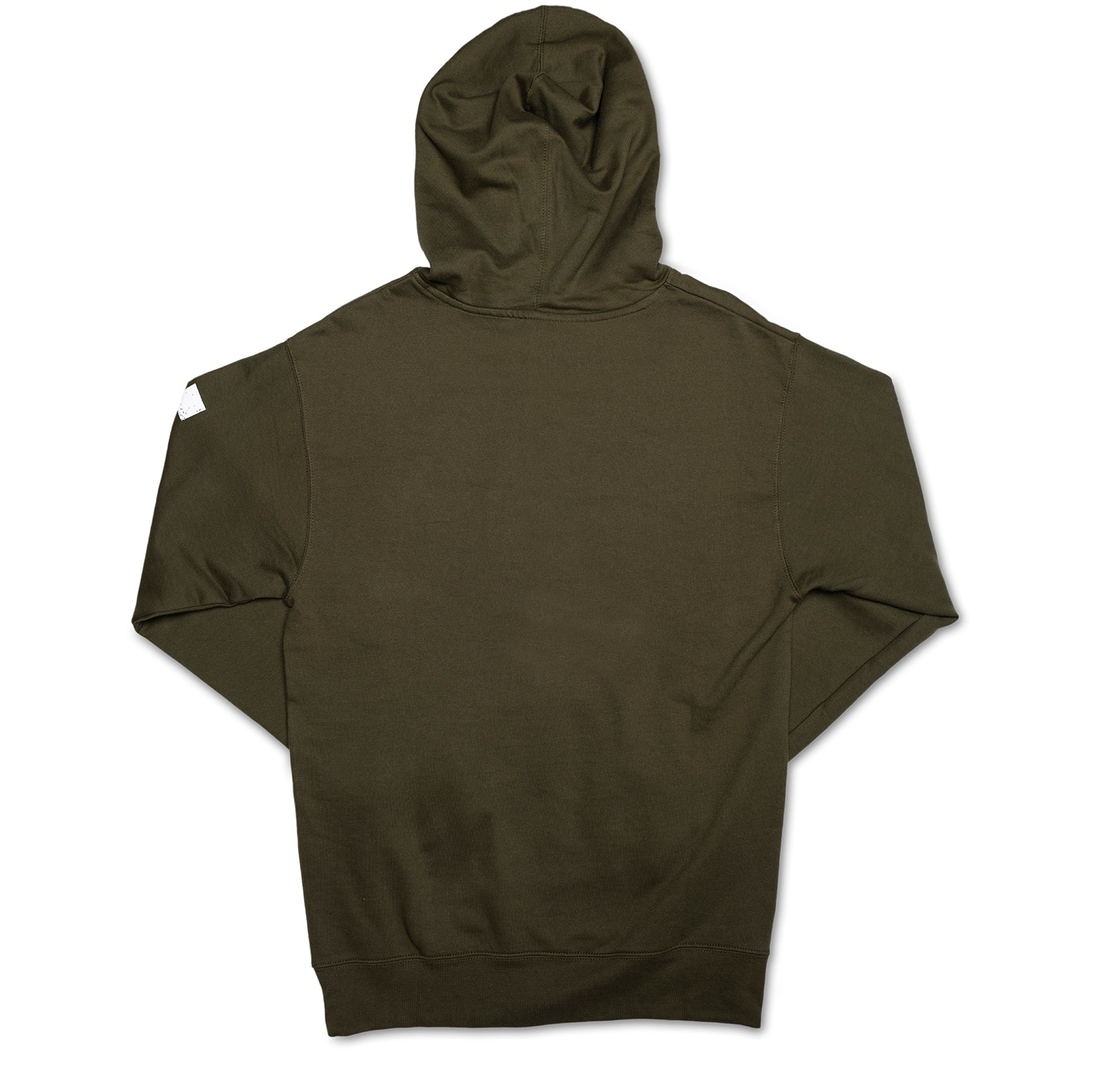 Heavy-weight pullover sweatshirt in olive green with flaming Boss Hoss pattern across the chest in white. The sleeves include screen printed designs as well. Made with 100% cotton. Adjustable strings around the hood for added comfort.